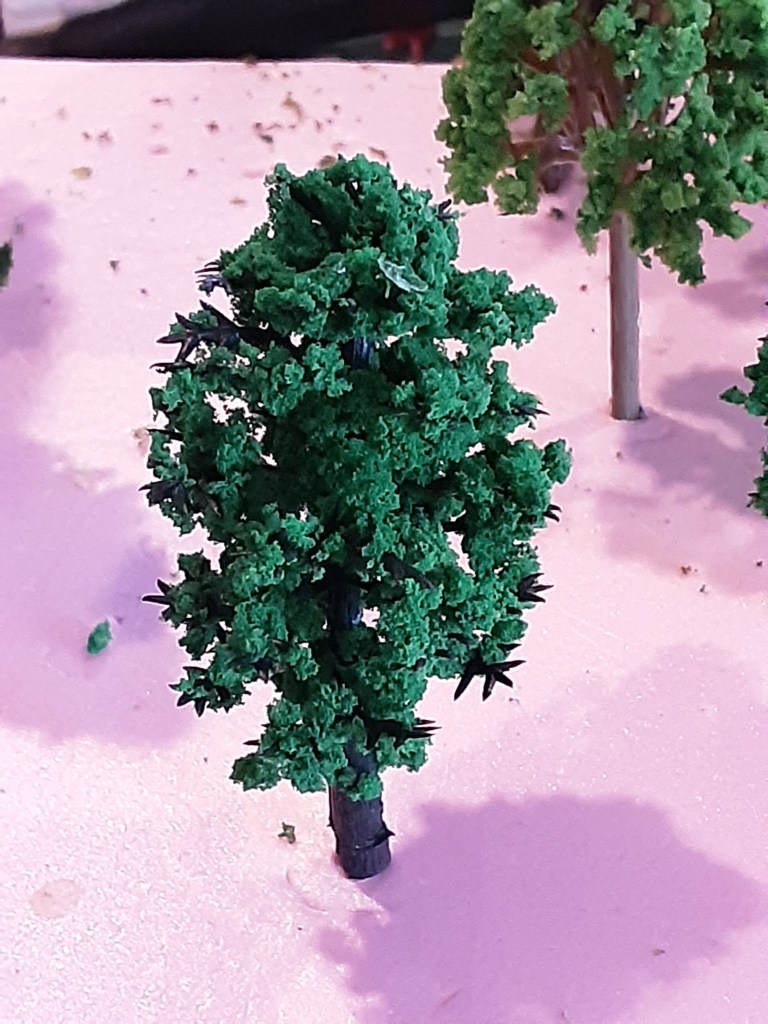 to fix this I sprayed the leafy area with Elmers adhesive spray. The sprinkled fine turf over the area just sprayed. Then resprayed and sprinkled a second time to fill out the tree.