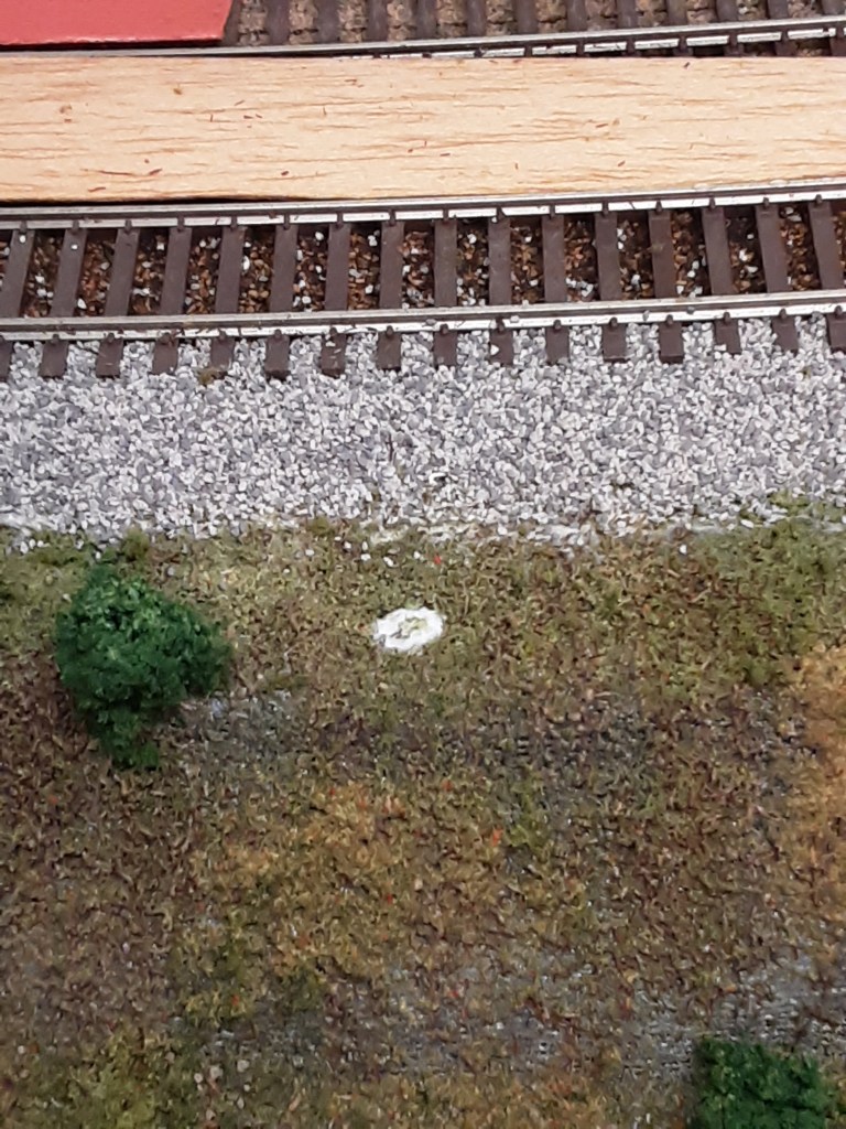 In this photo I have applied ballast, only from the rail to the grass. This area is in fron of the passenger station and I will apply ballast, brick or concrete at a later time.